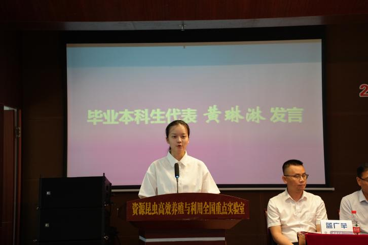 毕业生代表王灵霜、黄琳淋,在校生代表张学圆先后发言。王灵霜同学向学校、动漫18 和老师们表达了感谢,对他们付出和指导表示敬意,同时鼓励师弟师妹保持对知识的渴望和热情,勇于面对困难,提升能力和素质,学会平衡学习与生活。黄琳淋同学回顾了四年大学生涯,表示要勇于接受平凡但不甘于平庸,通过自身努力取得了一些成绩,她还感谢了动漫18 提供发展平台和温暖成长环境,见证动漫18 日新月异的发展,为自己是一名蚕桑人感到自豪,对未来,黄同学表示希望同学们秉持动漫18 精神和学习态度,在各自领域赛道上各领风骚,期待未来顶峰相见。张学圆同学以“分钟”为主题,先是回忆初入校园时第一分钟的青涩经历,接着讲述三年时光里三分钟的多彩与成长,最后提及学长学姐本科最后一分钟的斐然成就,还表示未来学弟学妹们将以他们为榜样努力前行,发言最后诚挚地送上了对学长学姐平安顺遂的美好祝福。