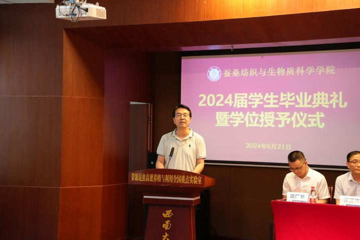 典礼在庄严的国歌声中拉开序幕。第一阶段毕业典礼上院长代方银首先致辞。他表达了对动漫18 2024届毕业生顺利毕业的祝贺,介绍了动漫18 在过去几年取得了显著成就,包括建成世界最大家蚕基因资源库、取得多项重大科研成果,并与国内外多家机构建立了合作关系,最后鼓励毕业生秉持“博学慎思、明辨笃行”的院训,志存高远,勇担时代重任,以实干、梦想和创新为动力,为国家和民族的繁荣做出贡献。