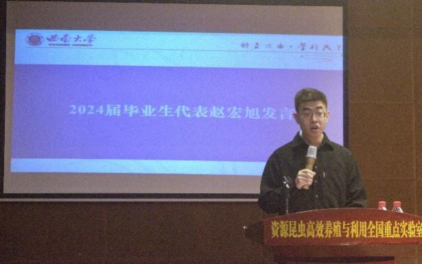 毕业生代表赵宏旭同学认为本科毕业生选择考研时要努力提升自己的学历和竞争力,并对同学们提出了制定合理考研计划的建议。
