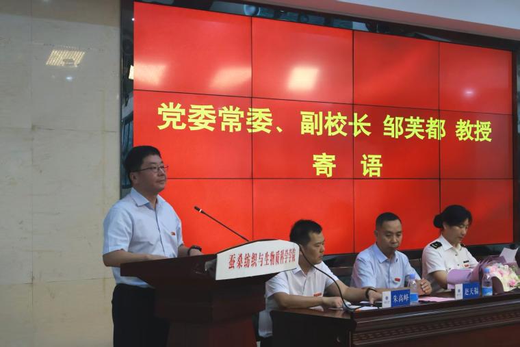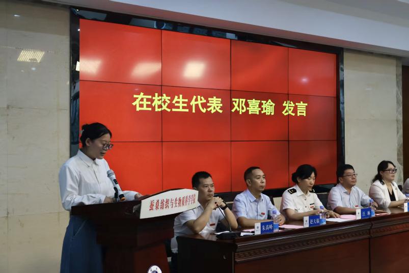 在校生代表、院学生会主席邓喜瑜同学以“青春织梦,薪火相传”为题,致敬学长学姐们用奋斗“编织青春经纬”的榜样力量,感念他们以星光点亮后学航程,并承诺将传承“含弘光大,继往开来”的西大精神。
