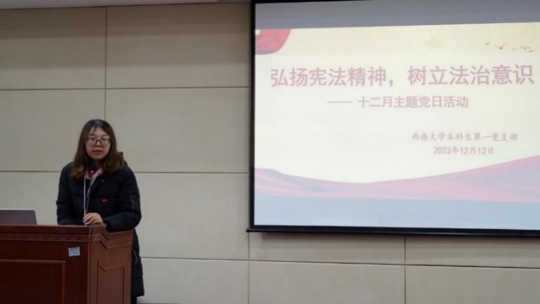 发布时间: 2023-12-18 17:54:57 已阅读:2023年12月12日,蚕动漫18 本科生第一党支部在45教101会议室举行“弘扬宪法精神,树立法治意识”主题党日活动,支部全体党员同志及入党积极分子参加,学校党校办公室主任余小蓉莅临现场指导开展活动,动漫18 党委副书记朱高峰列席参加,活动由本科生第一党支部书记尹萍主持。