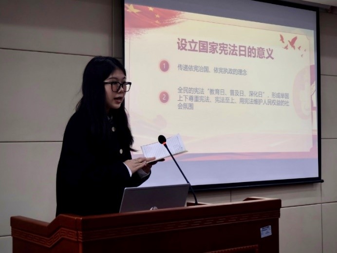 本科生第一党支部宣传委员陈可沁领学国家宪法基本知识,从宪法的地位、特征、构成等方面,结合日常生活事例,简要介绍了国家宪法及国家宪法日的重要意义,并重点阐述了习近平总书记在第十个国家宪法日之际作出的重要指示精神。随后,全体同志观看了《焦点访谈》专题节目《尊崇宪法精神厚植法治文化》,进一步领会了习近平总书记关于宪法的重要论述,认识了宪法的深厚底蕴、优势功效,提升了对宪法的政治认同、思想认同、情感认同。