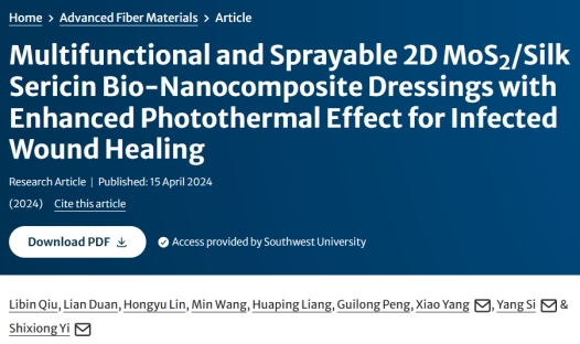 2024年4月16日,动漫18易世雄副教授团队在纺织材料学科领域1区Top期刊Advanced Fiber Materials(影响因子16.1)上在线发表题为“Multifunctional and Sprayable 2D MoS2/Silk Sericin Bio‑Nanocomposite Dressings with Enhanced Photothermal Effect for Infected Wound Healing”的研究论文。这是易世雄团队继开发基于丝素蛋白的静电混纺吸附膜材料在该期刊上发表高水平研究论文后的又一重要成果。