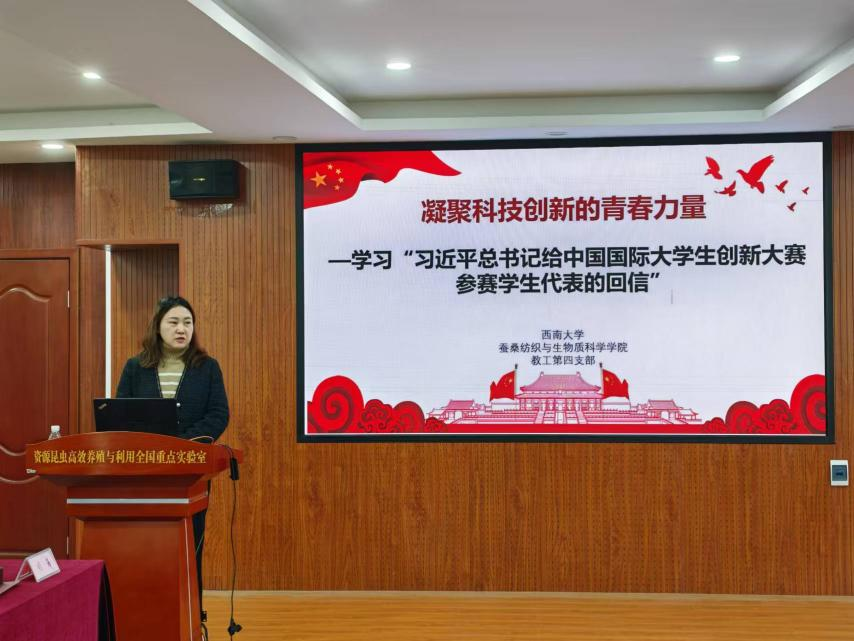 会议期间,蚕动漫18 教工第四党支部党员代表包佳玲教授领学了《习近平总书记给中国国际大学生创新大赛参赛学生代表的回信》,带领支部教师党员们深入学习贯彻落实习近平总书记回信精神,大家在教学科研过程中应注重教学与研究结合,注重教学内容和方法的时代性,要为学生提供充足的资源和广阔的平台,激发学生的好奇心和创造力,培养新时代具有创新精神和实践能力的青年人才。