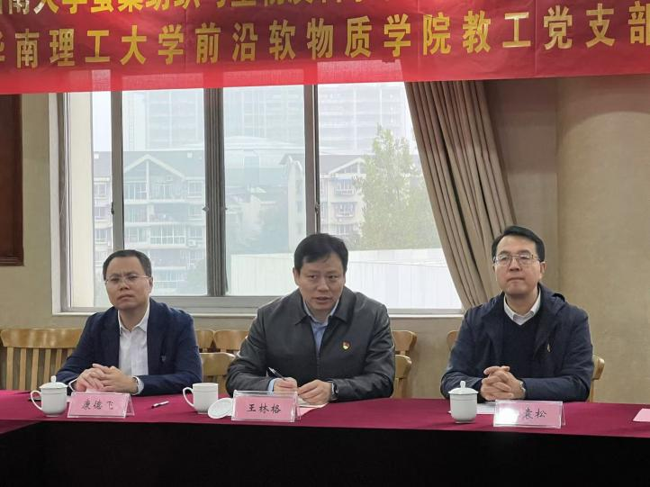 华南理工大学前沿软物质动漫18 教工党支部书记王林格教授介绍了该党支部的人员组成、党建工作特色及成效。他指出开展本次结对共建党支部活动,有助于进一步深化双方党支部交流合作,通过高质量党建活动赋能高质量人才培养体系和学科发展结构建设,实现党建与事业融合发展。