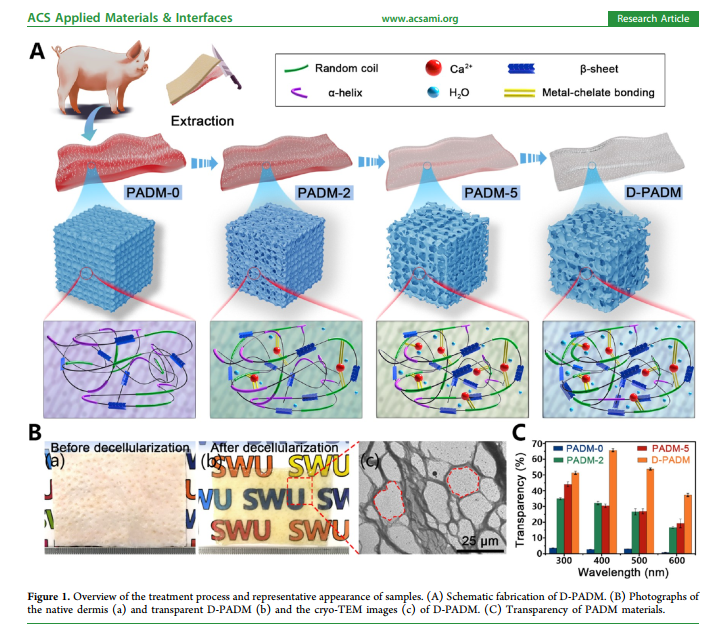 针对以上存在的问题,该研究团队通过CaCl2-ethanol-H2O三元溶液结合酶处理的方法,制备得到一种高透明度、富多孔机构、高弹性的猪脱细胞真皮基质,通过此方法在有效脱除细胞等抗原性物质的同时,能够更完整地保留真皮细胞外基质的主要成分。制备得到的透明猪脱细胞真皮基质敷料具有优秀的创伤修复能力和良好的生物相容性,可适用于大面积皮肤缺损伤口。本研究成果为制备满足皮肤替代物要求的脱细胞真皮基质提供一种新的思路。