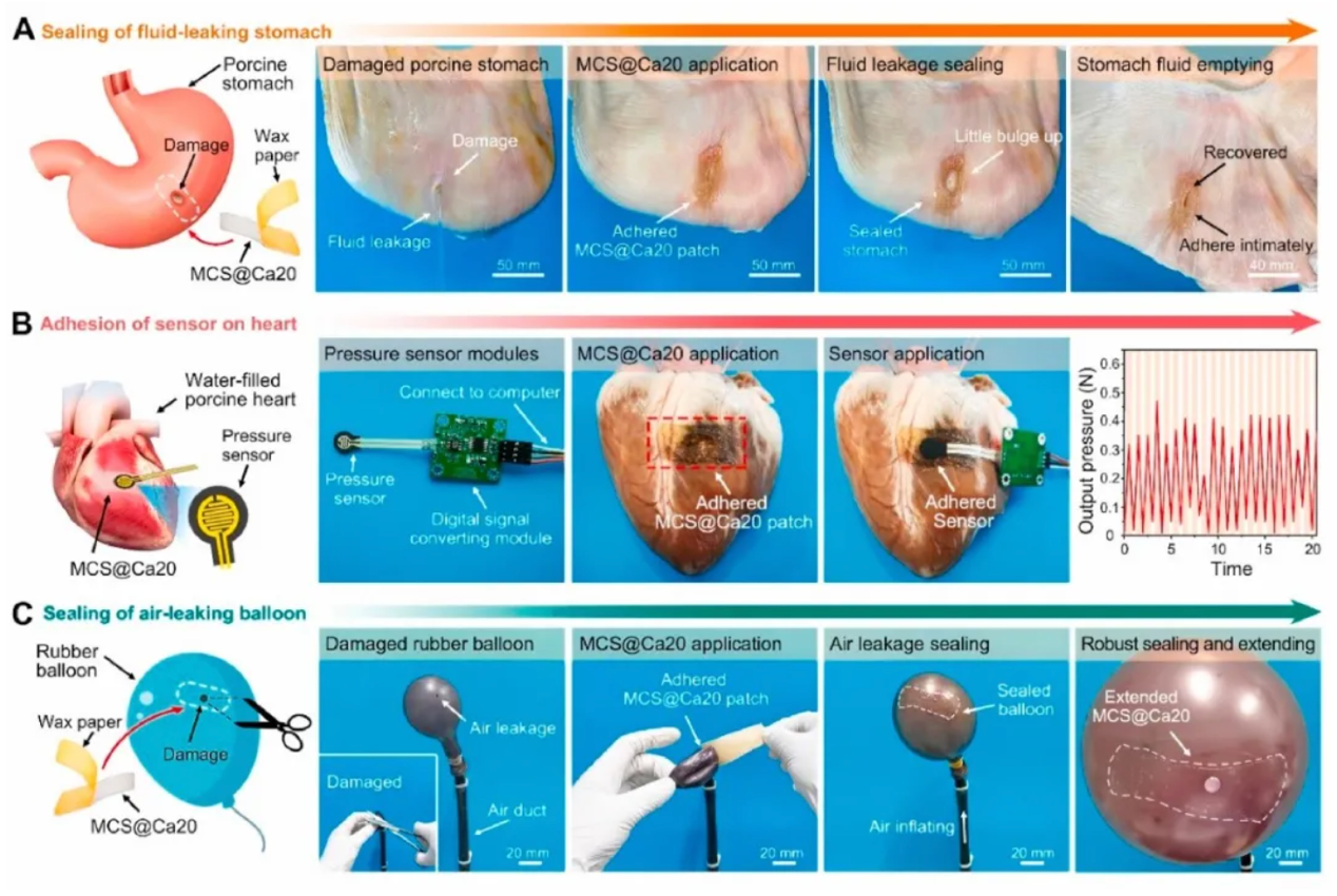 图5 蚕丝蛋白生物胶带MCS@Ca20对破口猪肚、猪心和气球的封堵作用