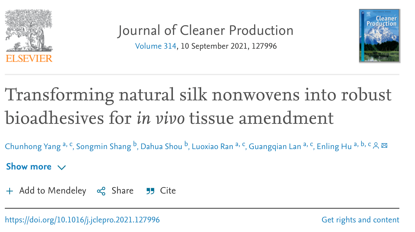 发布时间: 2021-08-31 13:05:27 已阅读:近日,动漫18 Bio-road生物医用材料研发团队在生态类旗舰期刊《Journal of CleanerProduction》(影响因子:9.297)上发表题为“Transforming natural silknonwovens into robust bioadhesives for in vivo tissue amendment”(由天然丝非织造布转化为可用于体内组织修复的生物粘合剂)的研究成果。该成果报道了一种将具有非织造布结构的天然桑蚕茧转化为可用于组织修复的生物粘合剂的方法。该方法不同于传统的将蚕丝纤维完全溶解得到蚕丝蛋白的方法。而是先用三元溶液(CaCl2 -乙醇- H2O)预处理桑蚕茧得到柔软透明的蚕茧片,然后用氯化钙-甲酸溶液进行表面改性得到具有高粘性的生物粘合剂,该种生物粘合剂可用于组织修复与缝合,为传统的缝合方法开辟了一个新视野。
