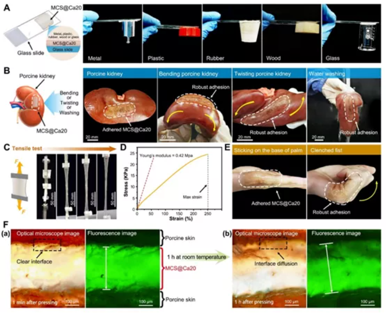 本研究通过一种简单的自上而下的改性方法,研发了一种具有高拉伸性、生物相容性和生物降解性的透明粘合剂,解决了传统缝合线的存在的问题。该种自上而下的方法不仅具有简单的优点,而且还保持了原始材料的完整性。而该粘合剂的最高粘附强度能够达到54 KPa。