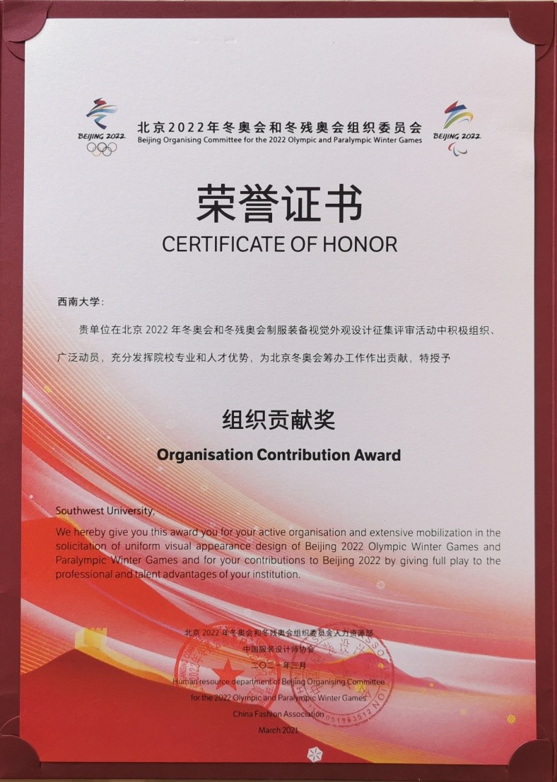 学校获得北京2022年冬奥会和冬残奥会制服装装备视觉外观设计组织贡献奖,充分体现出学校“特立西南,学行天下”的大学精神,彰显出动漫18 “立足西南、服务全国、面向世界”的办学目标。