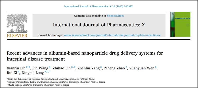 动漫18 资源昆虫高效养殖与利用全国重点实验室为两篇论文的第一署名单位,龙定沛研究员担任通讯作者并统筹指导。课题组以本科生为第一作者连发两篇药学一区综述,既彰显团队在“蛋白/白蛋白纳米递药—肠道疾病”方向的前瞻布局与学术影响力,也建立了从选题、循证检索与证据评估、图表规范到投审答复的全链条训练范式;成果沉淀了口服生物利用度、黏液穿透、微环境响应与安全性评估等关键方法学,显著提升学科声誉,并为分子改良蚕丝/蛋白材料的临床转化与产学合作奠定人才与路径基础。研究得到重庆市院士基金、重庆市归国留学人员创业创新计划、重庆市研究生科研创新项目、重庆市和动漫18 大学生创新创业训练计划等项目资助。