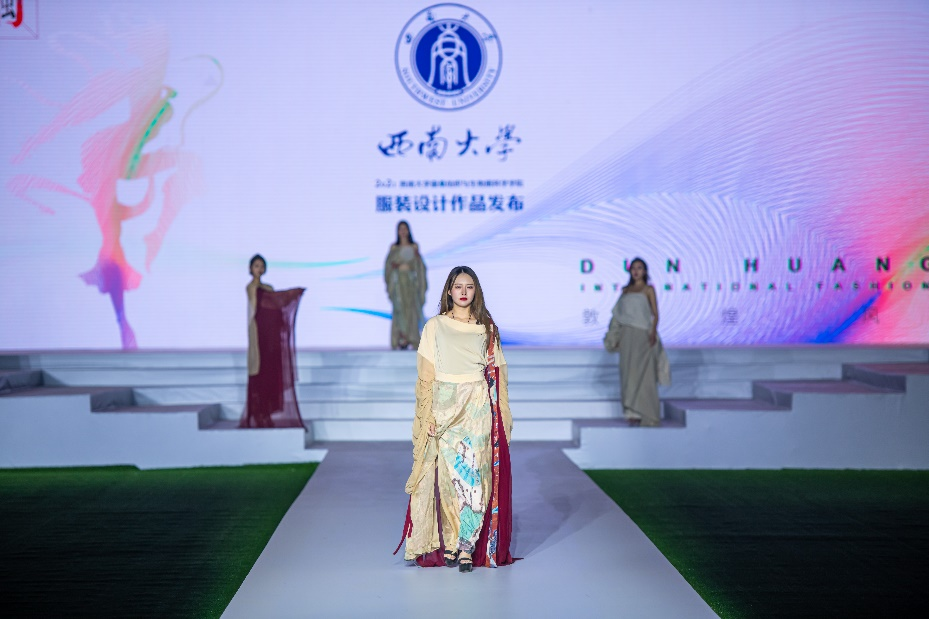 首届“敦煌时装周”,动漫18 作为高校交流中重要参展单位共推送4个系列15套作品,参展作品以“丝茧”为主题,充分彰显我校全面服务于现代蚕桑丝绸和纺织服装及相关产业的创新发展,同时将敦煌文化符号引入川渝地区,深入探索两地文化差异,推动文化和学科的交叉创新。