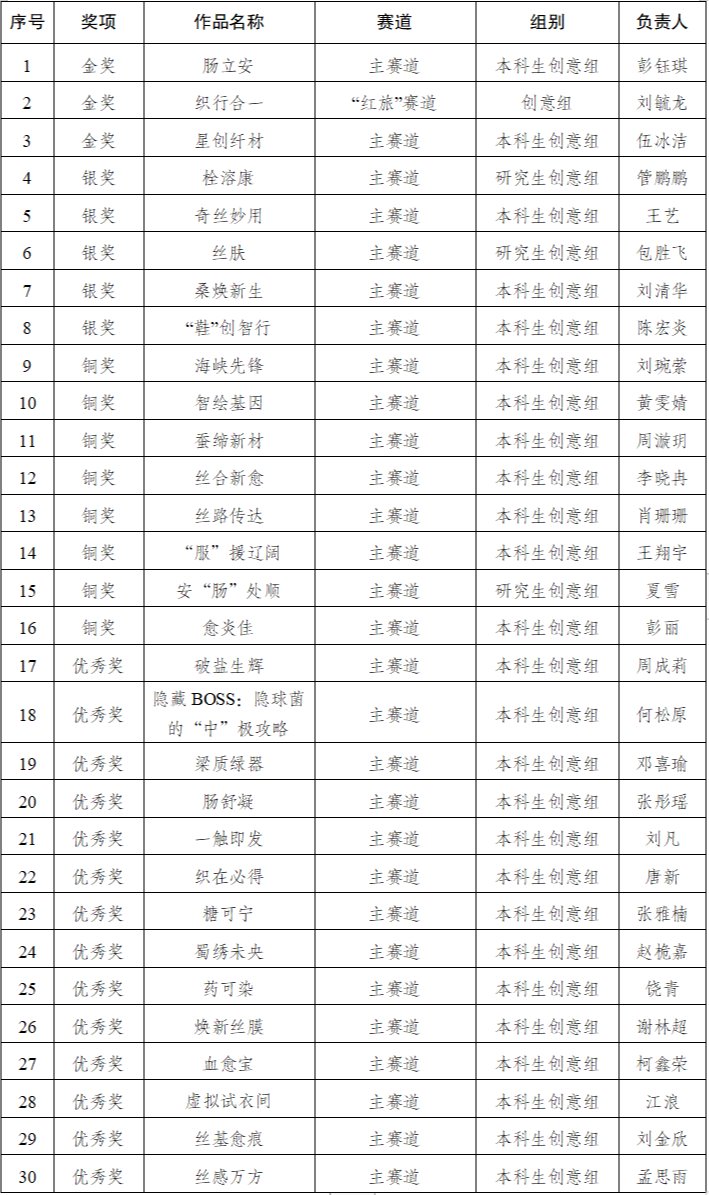 经学生申报、材料审核、决赛路演等,结合报名情况,共评选出30项获奖项目,其中,金奖3项、银奖5项,铜奖8项,优秀奖14项,现予以公示(公示名单附后,排名不分先后)。