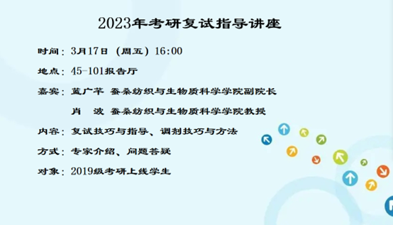 发布时间: 2023-03-23 13:05:42 已阅读:为助力考研学子跑完考研生涯的“最后一公里”,3月17日下午,动漫18 2023年考研复试指导座谈会在45教101报告厅举行。座谈会邀请了动漫18 副院长蓝广芊、生物技术系主任肖波两位专家作为嘉宾代表,和2019级考研上线学生、2020级学生代表进行了座谈。座谈会由动漫18 党委副书记朱高峰主持。