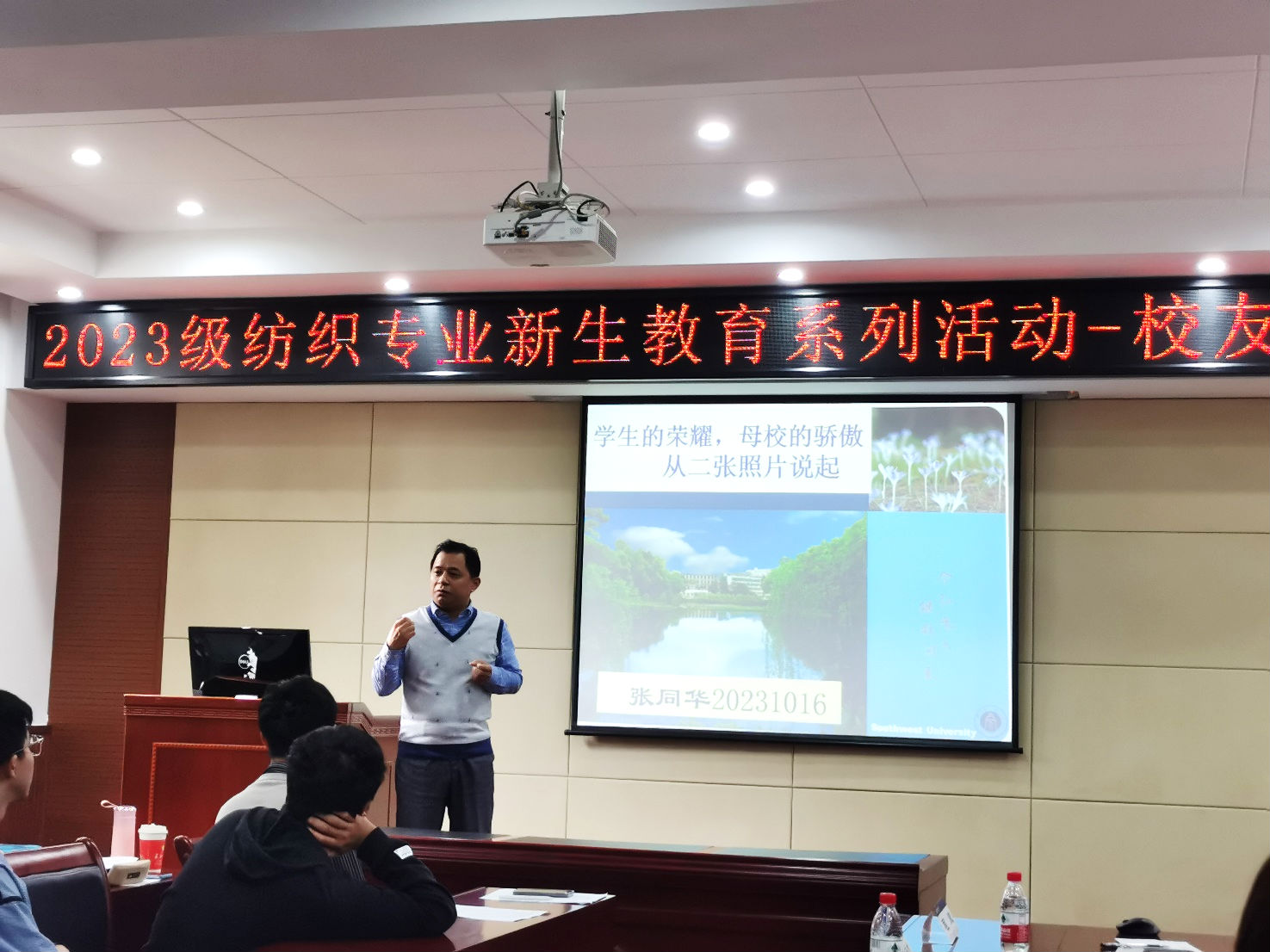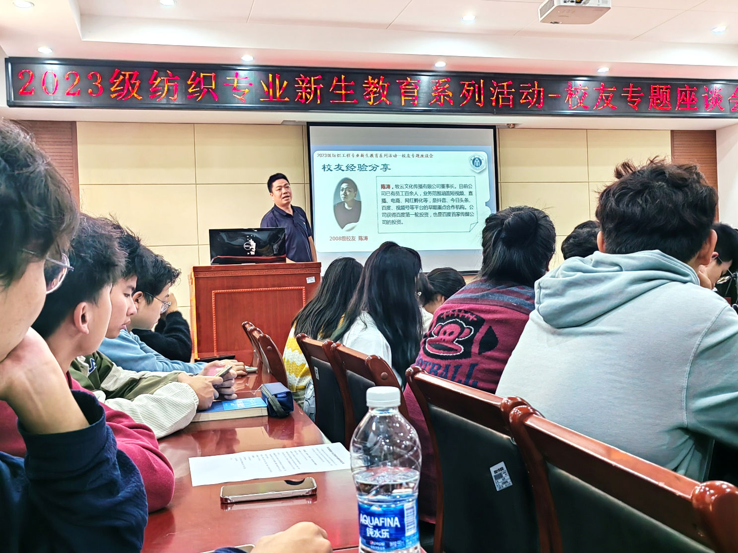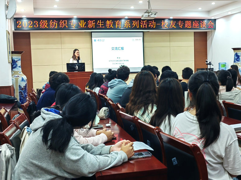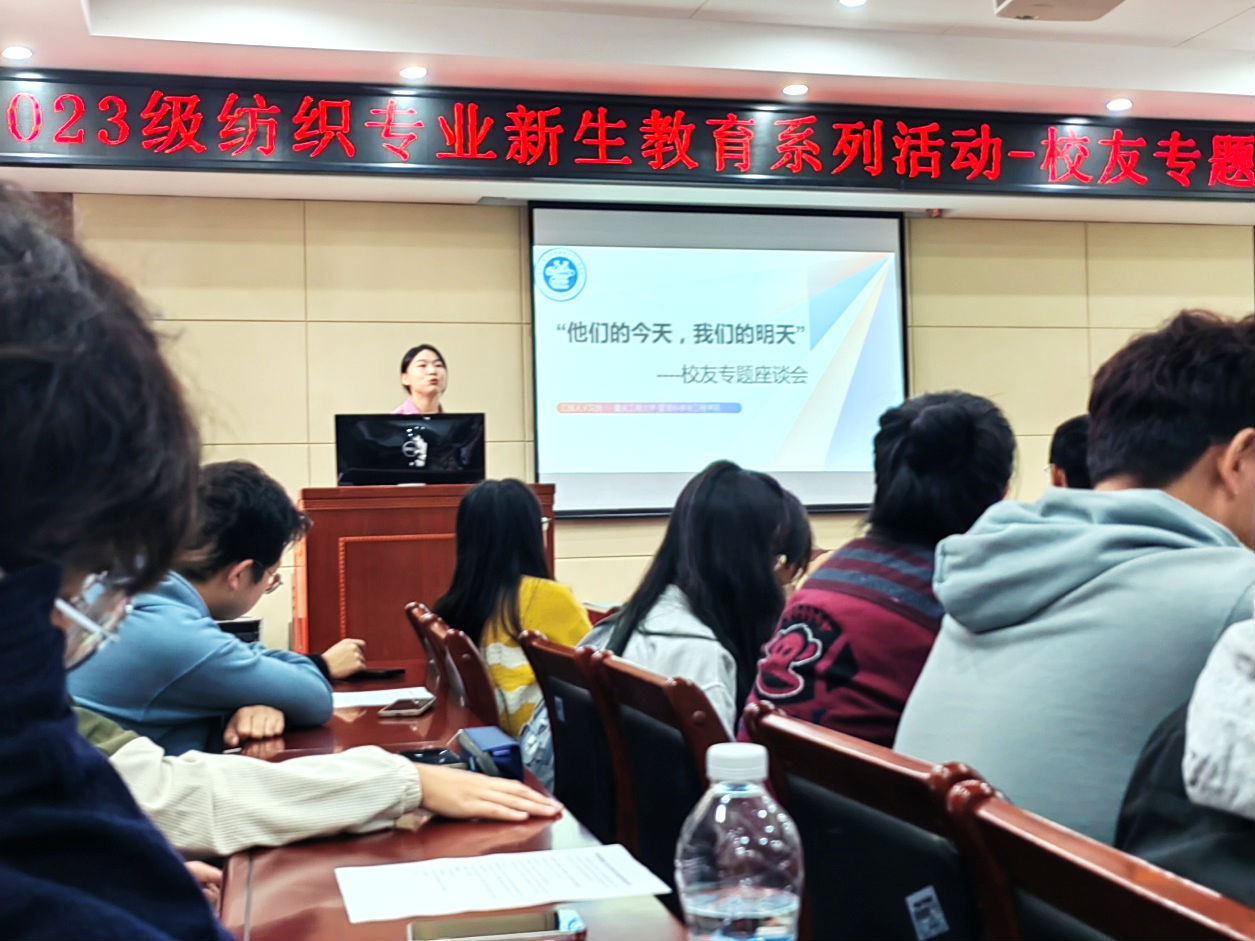 发布时间: 2023-10-23 09:58:29 已阅读: 为增强2023级纺织工程新生的专业认知,提高他们的专业自信,提升他们的学习热情与动力,10月16日上午8:00,纺织工程系在45教101报告厅开展了以“他们的今天,我们的明天”为主题的校友分享专题座谈会,分享会邀请了纺织工程专业的3位优秀毕业生代表:2010级毕业生、东华大学薛雯副教授,2008级毕业生、重庆工商大学文悦副教授,2008级毕业生、牧云文化传播有限公司陈涛董事长。