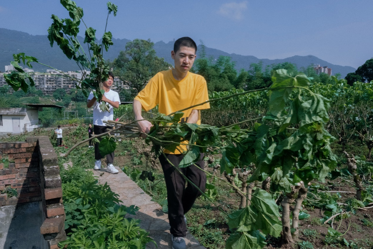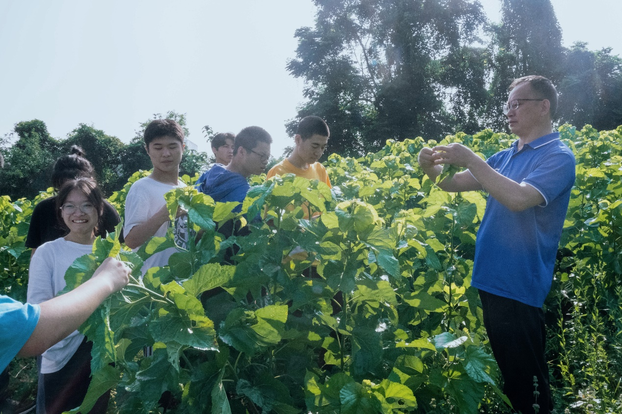 “摘桑叶——通过采摘叶片、保留叶柄、不伤枝皮、保护腋芽的方式来采摘桑叶,将采摘的新鲜桑叶收集好放入口袋中,留待转移至基因库。”随着敬成俊老师的细致讲解,学子们按照要求分别为蚁蚕、小蚕和大蚕摘取了符合其食用标准的桑叶,同时,修剪枯老桑枝,帮助桑园“获得新生”。